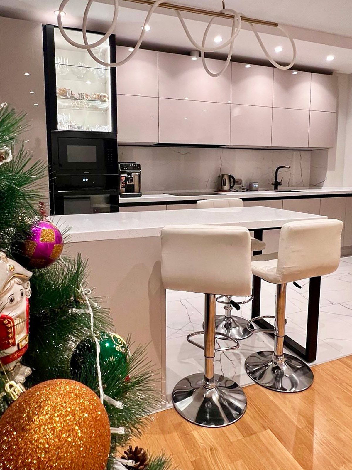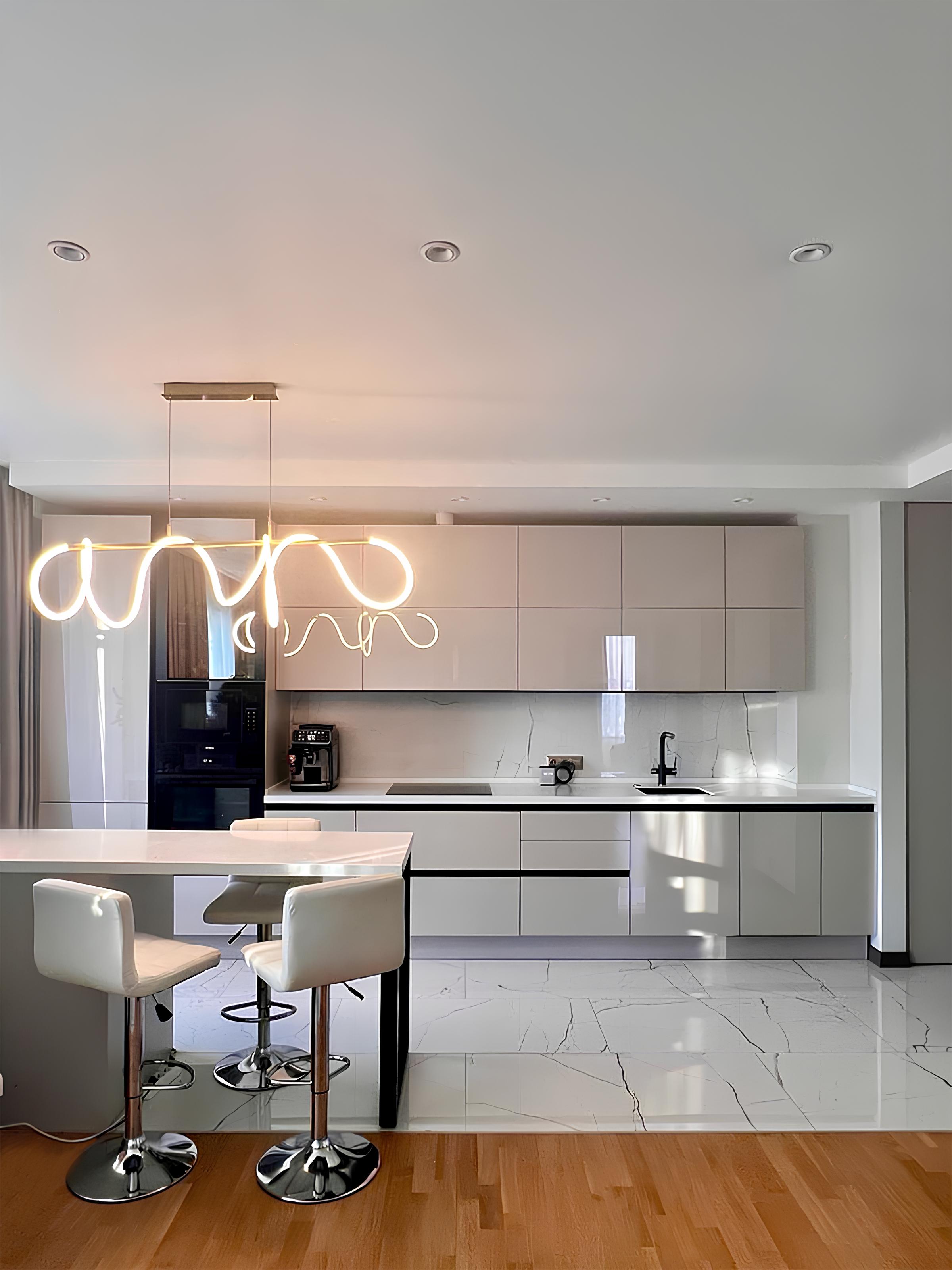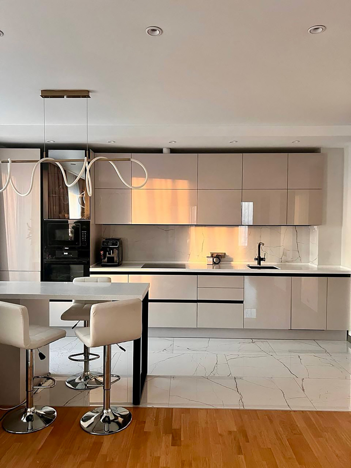 Глянцевая кухня в светлых оттенках с островом