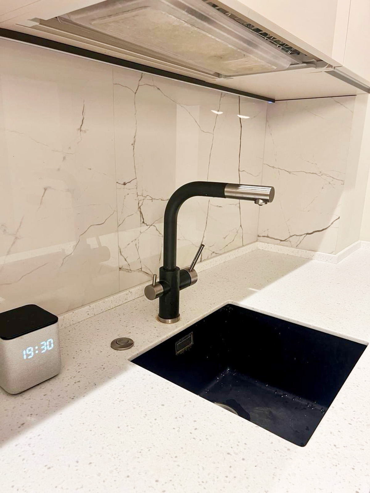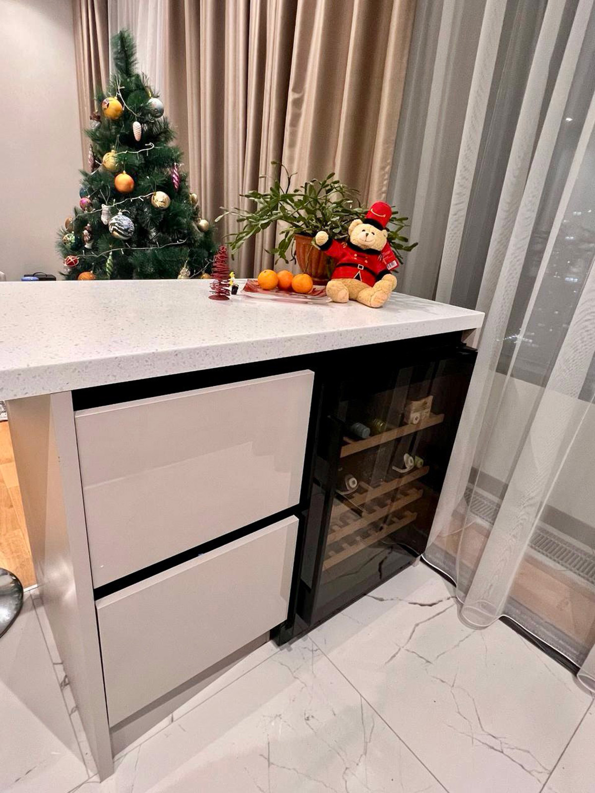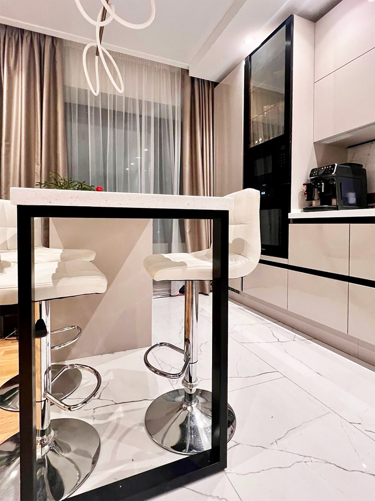 Глянцевая кухня в светлых оттенках с островом